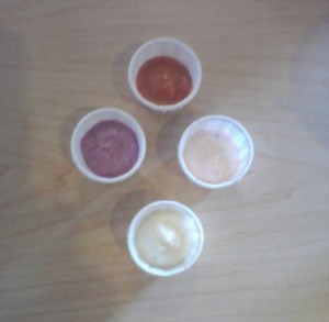 | Clockwise from top: fry sauce, sour thai, garlic aioli, blueberry ketchup |