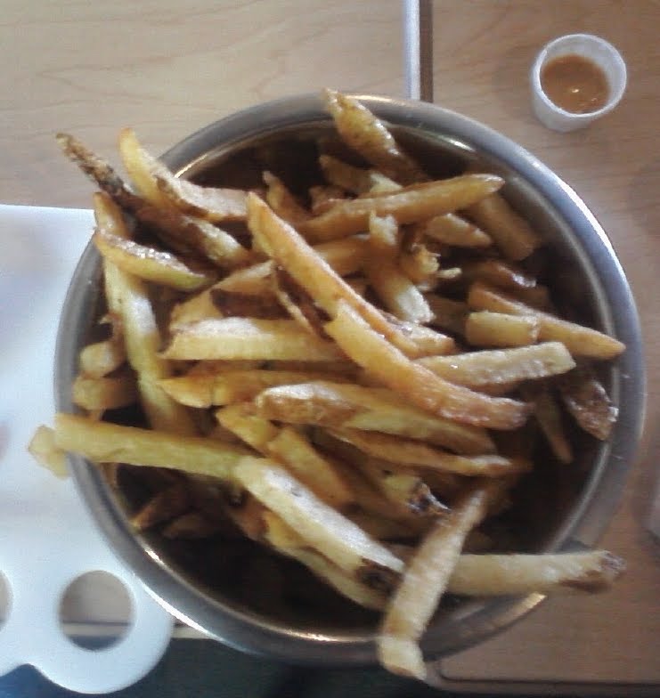 The first thing that grabbed me was the size of the order. I guess for that price I shouldn’t have expected a small, but this would have been a meal by itself. The smell was tantalizing, and I loved the flavor from the very first bite, alien though it was. I was already wondering where I could obtain my own black truffle salt and what uses I could put it to when a sort of mass realization swept over the table: the fries here simply are not that good. Bear with me here. I’m sure just like steaks, people have their own idea of what the perfect french fry is. To me, the perfect fry is more golden than brown, crispy enough on the outside to stand erect and almost mashed potato-like in the center. Furthermore, they should be salted right after cooking and left to drain as much oil onto a clean towel as possible before being served while still piping hot. This is rarely possible, but when this combination is achieved it’s a wonderful thing. Do you agree? Now take a look at the first picture above again. Those are limp, brown, greasy fries. And while I expected my duck fat-fried fries to be a little on the oily side, I don’t know why the russets would share the same fate. My theory is that the hook is their variety of materials, salts and sauces, and this was enough to keep us amused for a while. Unfortunately though, the fries just aren’t enough to stand on their own. This was severely disappointing considering the hype surrounding the place and how amazing their burgers are. And to the people who have said something along the lines of “you have to get the purple fries with the rosemary salt and garlic aioli!” or are thinking about it, if that’s their best then why bother with all the other options? Would it really be that bad to be “just another burger joint” if you’re one of the best in town? And to those who would say that a brown, limp, greasy fry is fine so long as it tastes good, I can say only that we had an eight year-old with us. Children, while you can argue that their palates are unrefined, are simple creatures when it comes to food. They don’t care about where the potatoes come from, if they’re organic, what type of oil was used…they might be somewhat impressed by color and shape, true…but in the end, what matters to them is whether or not it tastes good. When this particular child was asked how the fries tasted, she replied “They’re flavorless. This is horrible.” And this child, while notoriously picky and a little dramatic, does like fries. Just not these. Would I go back? In a word, yes. A truly great burger is worth braving downtown for, especially if you’re in the area anyway and the restaurant isn’t in the heart of downtown itself. I’d likely even try one of the other unusual fry types, but would do so mostly out of curiosity and never losing sight of the fact that, to me, they are the side dish. My quest for the best french fries in town continues…