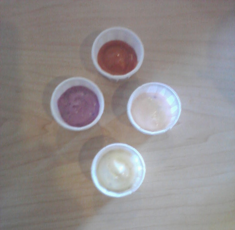 | Clockwise from top: fry sauce, sour thai, garlic aioli, blueberry ketchup |