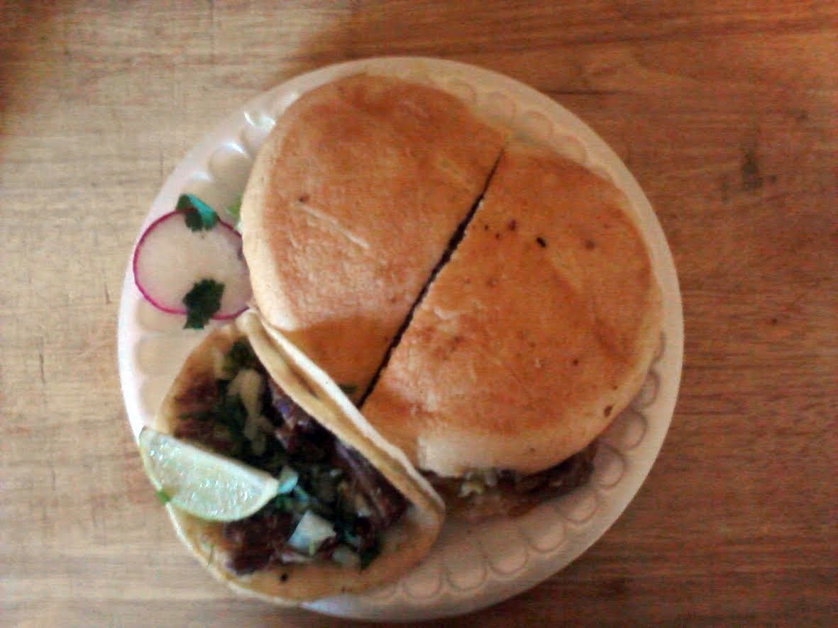 Even though I wasn’t on my lunch break this time, it was hot out and I decided to take my feast home and enjoy it in an air-conditioned climate. When I got the foil off the plate, I was very happy to see my old friend the telera roll.