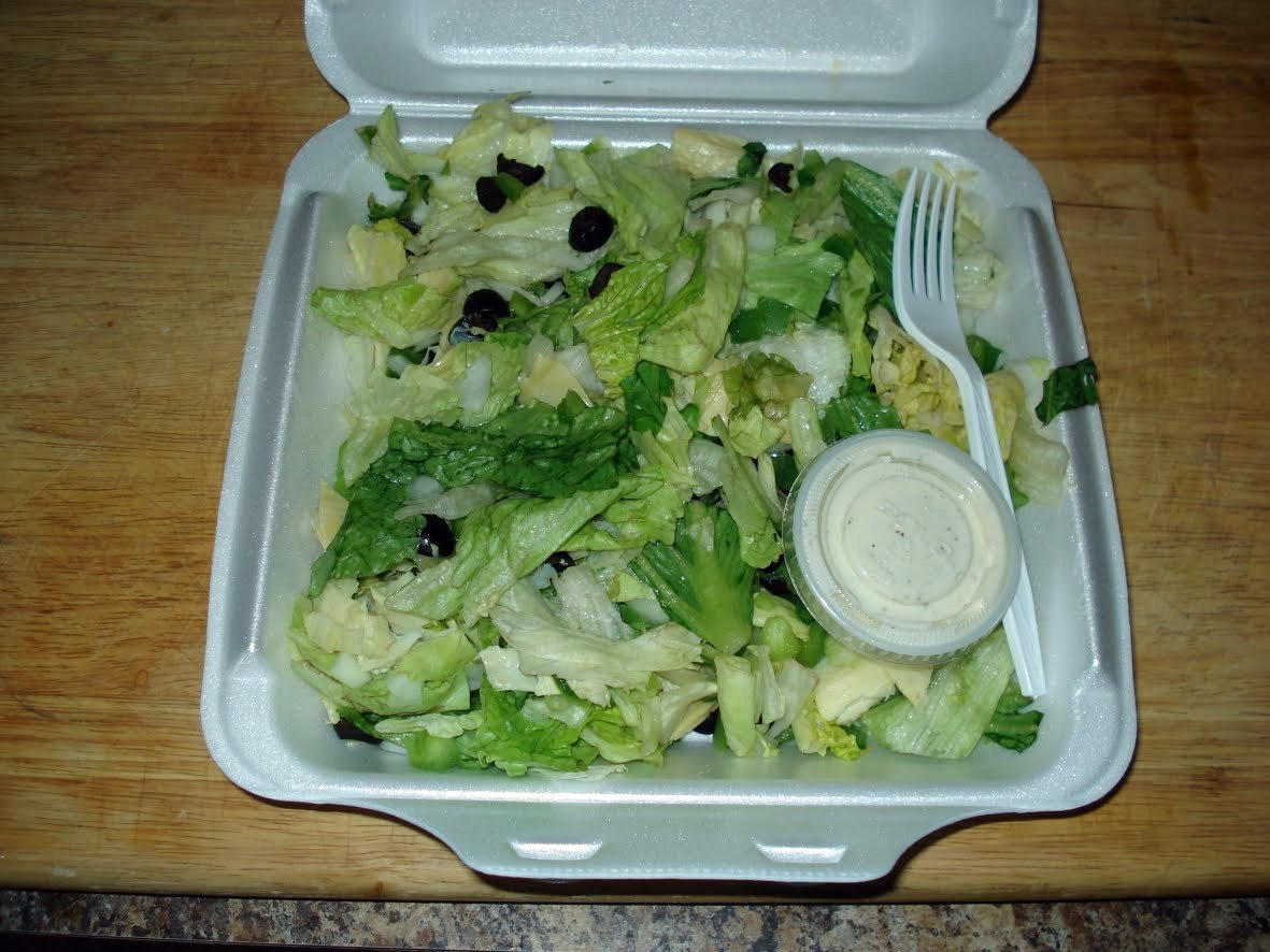 For some reason, it appears to have been decided that a salad at a pizza place should cost roughly $3.50.  I’m not sure how we arrived at this consensus, but there it is.  At some places, that $3.50 doesn’t get you much more than dry greens and a little cup of dressing, but not so here.  In this instance, I’m happy that my incompetence with the flash reared its ugly head so you can see how moist that salad is, and I can assure you that it wasn’t at all slimy.  While the little cup of dressing issue also applies here (I paid an extra fifty cents for another little cup, Track’s girlfriend likes her dressing) and they only have ranch dressing to begin with, it’s still very worthwhile to get the salad here.  For example, look at it compared to the fork.  That’s a pretty big pile of greens, and by itself it would easily be a meal.  Better yet, it’s a build-your-own salad, and so far as I know you have access to everything on the pizza menu including artichoke hearts, and they’re pretty generous with them.  The picture above is what you get if you call and say you want “a salad with all the veggies, tomatoes on the side” (Track’s girl doesn’t like them).
