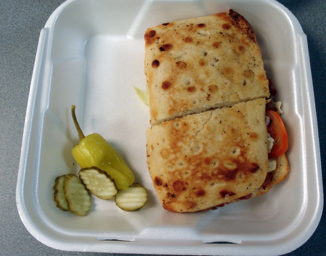 I’m not in love with the name “Turkey Pesto”. I really do think it should be the other way around. As you can see, there are only a few slices of turkey on this thing, but the pesto is very present. I adore pesto, but I’m not a snob about it. I even like the little Knorr packets (just add olive oil and water). The key, in my not-so-humble opinion, is balance. Too much of any of the ingredients (especially if it’s too much oil or too many pine nuts) spoil the sauce. Idaho Pizza Company’s balance is just fine with me. The bread is, if anything, given even more love here, seeming to have been treated with even more herbs and cheese. The cheese inside the sandwich stands out more, but it needs to given the strength of the sauce (the cheddar/mozzarella blend from the club sandwich wouldn’t cut it, believe me). The turkey, lettuce and tomato all do their part, which is to add substance so you’re not just eating toasted garlic bread with melted cheese and pesto smeared all over it. The mayo you don’t really taste, but I’m sure it makes the whole affair just a little richer and creamier. Just like the pesto sauce itself, the sandwich is all about harmony, strong flavors and subtle ones working together to achieve a result that is more than the sum of its parts. I know, that’s a lot of praise for a sandwich, so feel free to try one yourself and tell me that I’m wrong. So far, nobody has.