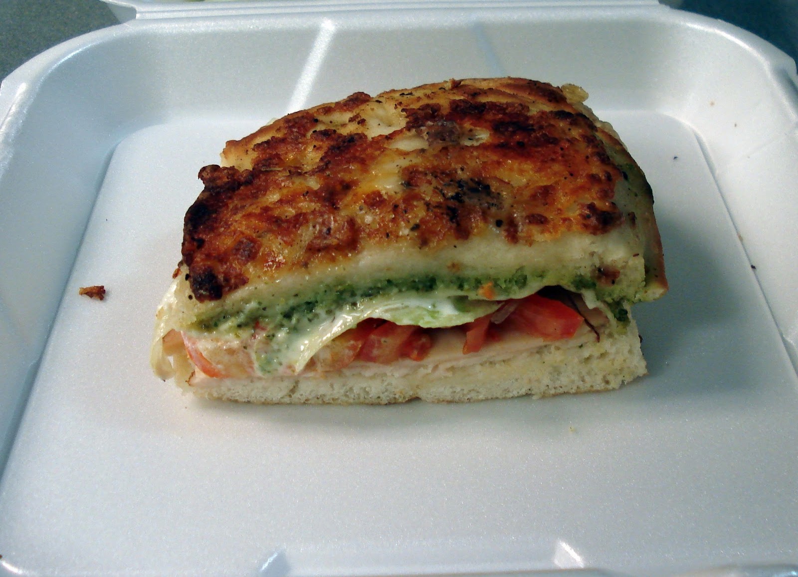 Now their pesto sauce is very good, but this description leaves out the most important component, which is tucked away in the general description at the beginning of the menu’s sandwich section: