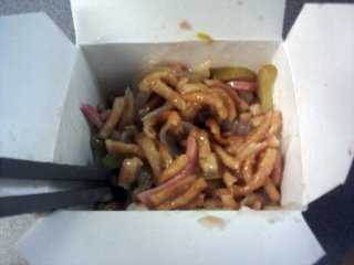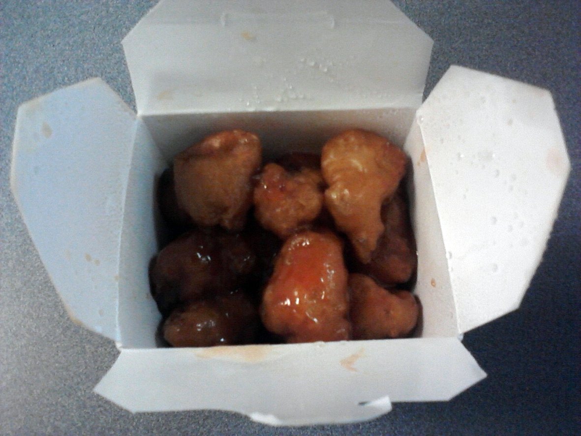 This one disappointed me immediately. I couldn’t (and still can’t) recall the last time a Chinese restaurant had just dumped a little sauce in with the food and called it good. Generally, restaurants put the meat in a box and then the sauce in a smaller box or a little Styrofoam or plastic container. I did discover a little pool of extra sauce at the bottom of the box, and the breading on those pieces had become soggy and was falling apart. I lost all interest in this dish when I found the third large chunk of gristle. Also, as you can see above, not all of the pieces of pork had gotten a lot of sauce on them. I tried one nearly dry piece, and I’ll be damned if I didn’t taste that fish and chips batter again.