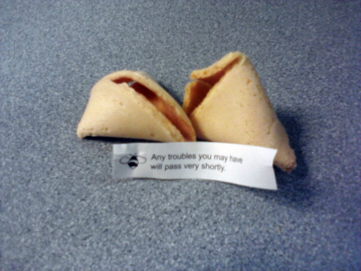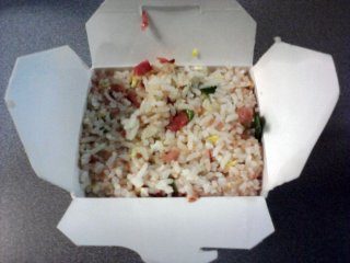 Finally I moved on to the fried rice, which ended up being the best part of the meal. It was pretty much just the way I like it, not too oily and with egg, scallion and crispy little bits of ham throughout. I’m just not one of those people who enjoy peas and carrots in my fried rice. If I happened to be in the area and just wanted a box of fried rice to go, I’d consider stopping in again, but I think it unlikely that I’ll ever actually return. In the bag, along with a napkin, plastic fork, little plastic tub of Chinese hot mustard and one (?!) packet of soy sauce, there was a fortune cookie. Something about it just put me off.