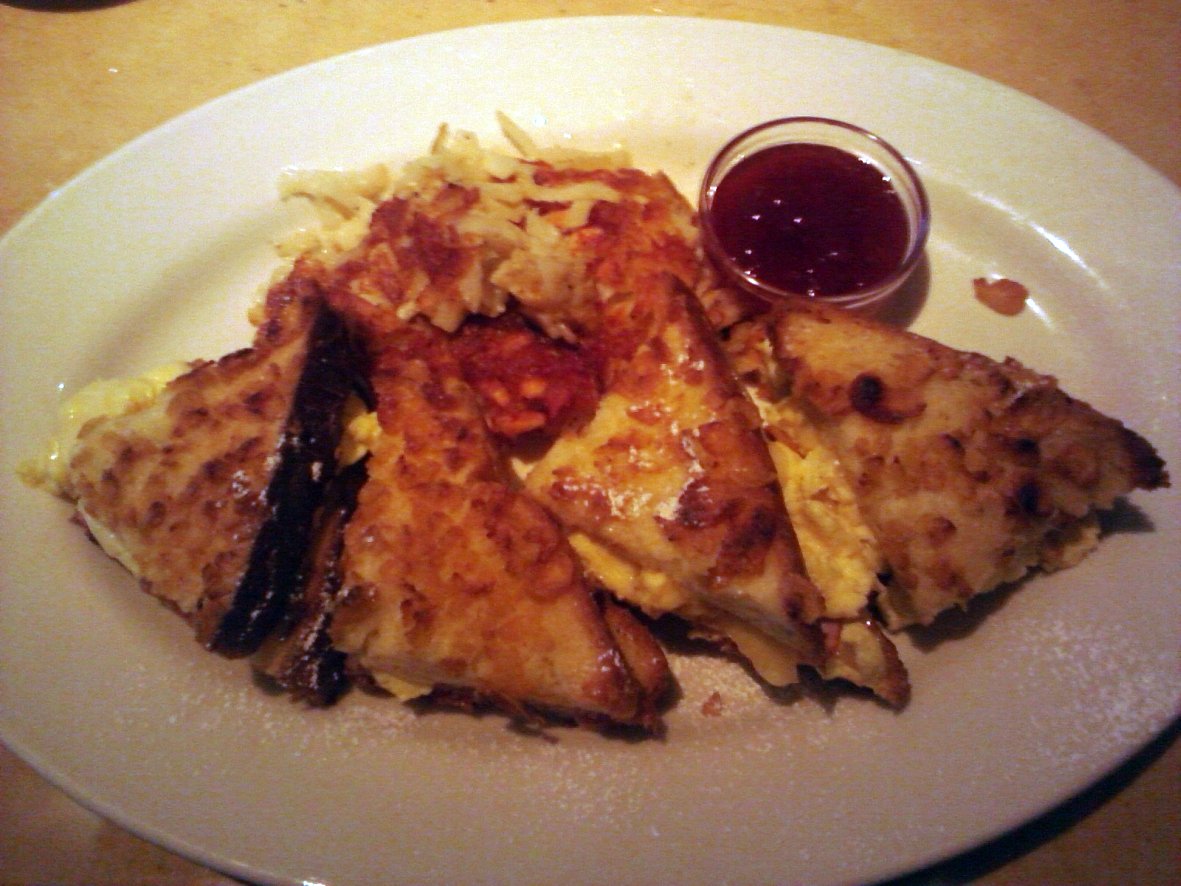 What you see above is the Monte Cristo sandwich from The Cheesecake Factory‘s Sunday brunch menu. I know it’s something of a culinary staple, but I’d never had one before. This particular version consists of scrambled egg, grilled ham, bacon and melted Swiss cheese. Rather than dipping the entire sandwich, French toast is used as the bread. Then the whole thing is lightly dusted with powdered sugar and served with strawberry preserves. The end result is much better than it has any right to be, and something that I wish (for health reasons anyway) that I had never been introduced to.
