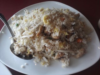 The Snow White Chicken and Chicken Fried Rice were next to arrive. The former might be my girl’s favorite Asian dish, but even though I’ve seen it on several Chinese menus and even more Thai ones, I’d yet to try it. There were big chunks of thin chicken, water chestnuts, mushrooms and bamboo shoots. The sauce is very mild and I ended up adding soy sauce to mine. The girlfriend enjoyed it but says there are better versions around. For my part, I could see ordering it again if I was craving something light with lots of veggies.