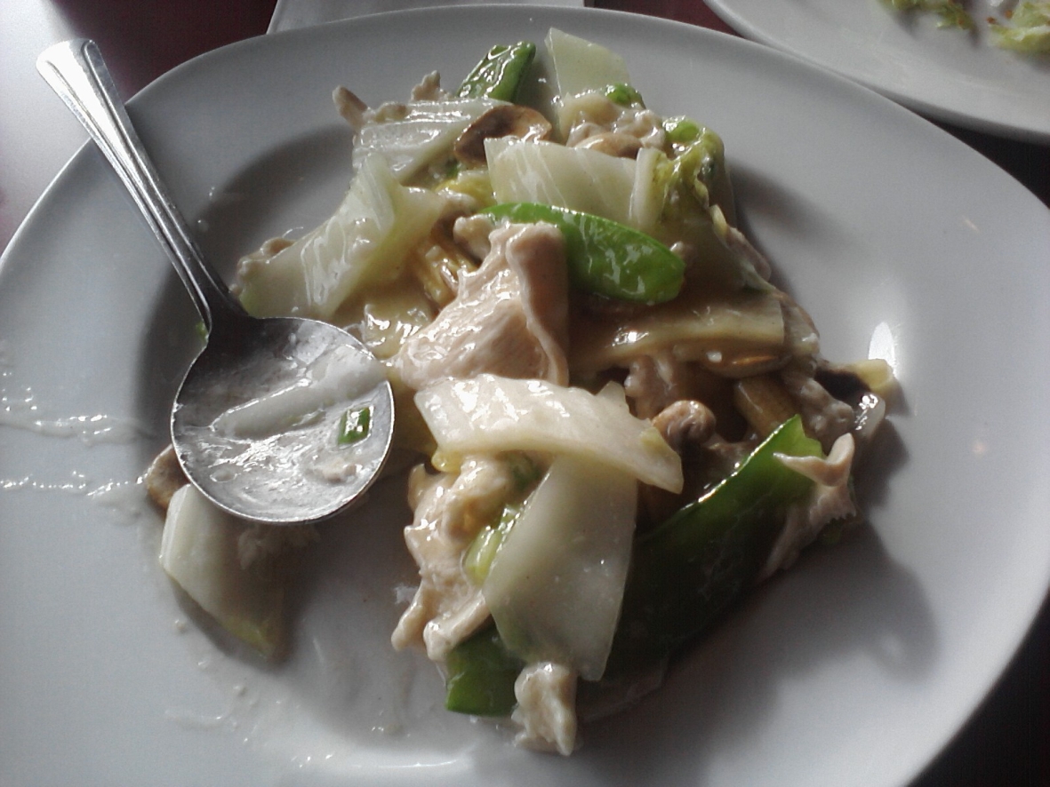The Snow White Chicken and Chicken Fried Rice were next to arrive. The former might be my girl’s favorite Asian dish, but even though I’ve seen it on several Chinese menus and even more Thai ones, I’d yet to try it. There were big chunks of thin chicken, water chestnuts, mushrooms and bamboo shoots. The sauce is very mild and I ended up adding soy sauce to mine. The girlfriend enjoyed it but says there are better versions around. For my part, I could see ordering it again if I was craving something light with lots of veggies.