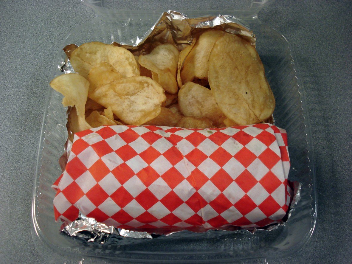 Not only was the feta I paid extra for nowhere to be seen, but there was no tzatziki sauce. I stepped outside, called the restaurant and asked if I had left anything sitting there. They assured me that the cheese and sauce were in there, and that they put them in separate little cups when it’s a take-out order so the gyro won’t get soggy or messy while you’re traveling. I advised the woman I was speaking to that I had double-checked the bag and all its contents, to which she replied that the condiment cups were likely underneath the potato chips. To be honest, I hadn’t checked there, so I thanked her and went back inside to take a look. Still no condiments. I called back and told her I was now certain that I didn’t have the items in question. She put me on the phone with her boss, and I explained the situation again. He said that I could swing by and pick up some sauce and cheese, but by this point there was no way I could make it back before my lunch break was over. He then offered to bring the stuff to me, but I figured by that point the food itself would be ice cold. Tersely, I told him not to worry about it and hung up. I went back inside and picked up my gyro, already thinking about ways of describing how dry and bland it was when I finally got around to doing my write-up.