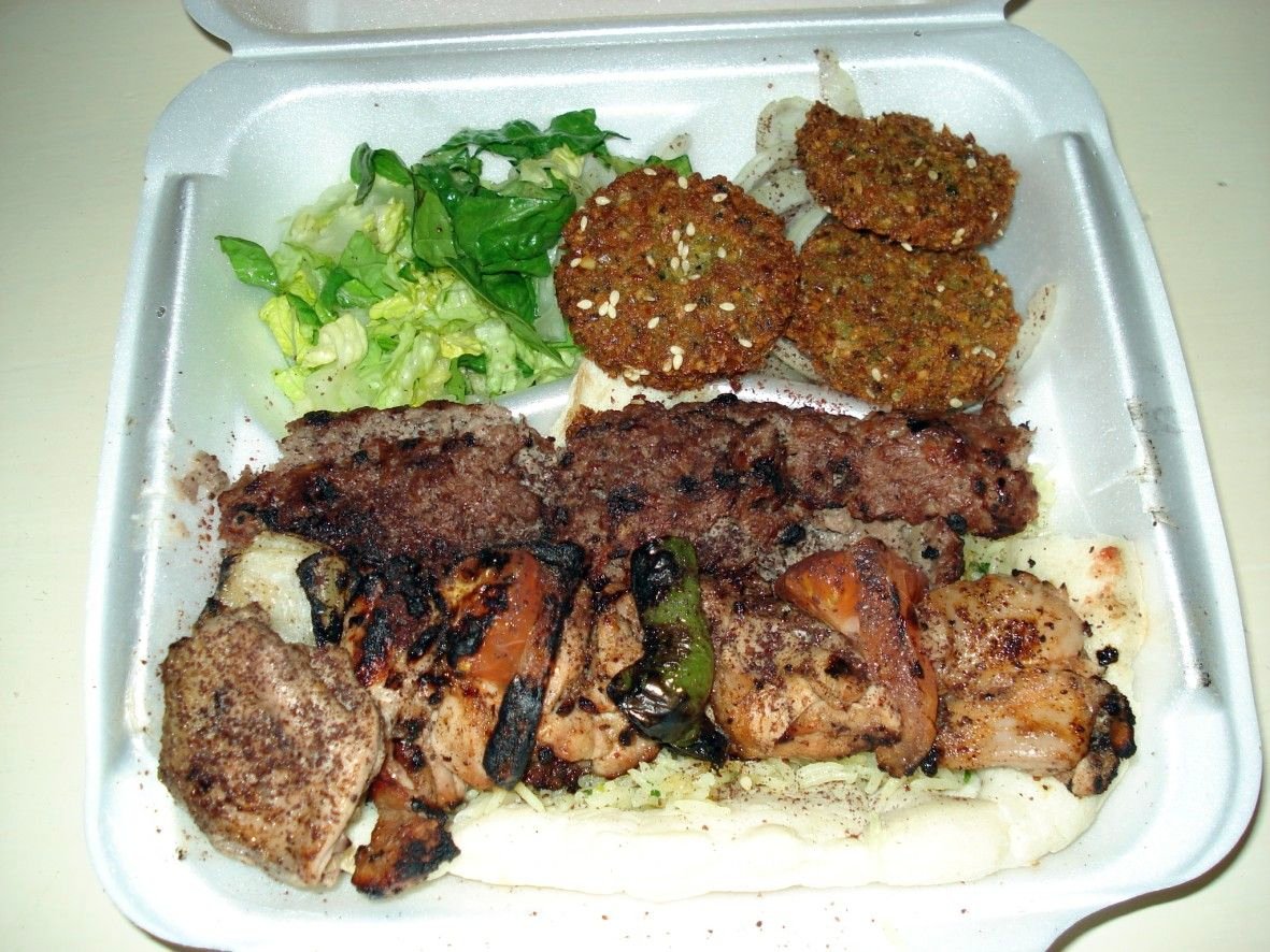 | From top down: falafel, beef shish kebab, and chicken kebab. |