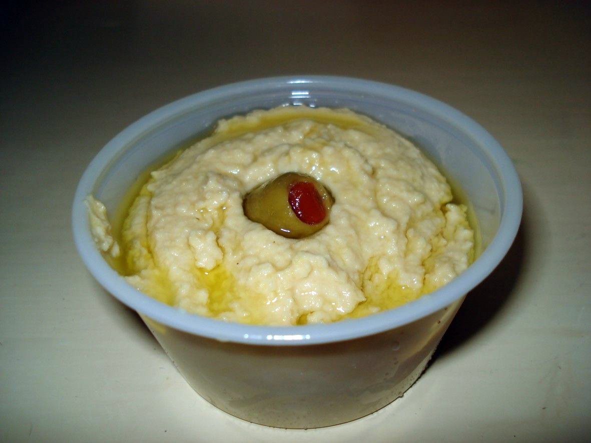 | Hummus. Don’t ask me where they found that adorable, tiny little olive… |