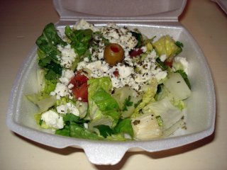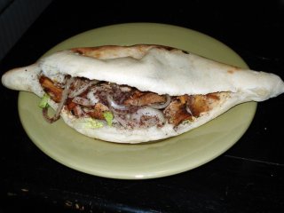 Not having any idea how to attack this, I started from the top. The falafel had great flavor and texture, but as everything else would, it suffered a bit from the long car trip, and unfortunately it’s not really something that you can re-heat. The beef shish kebab was the biggest surprise of the evening for sure. It looked like steak but was actually more like a grilled meatloaf or gyro meat. I have to admit I was put off a little at first because it was so unexpected, but it was still good and I was back on track quickly enough. The chicken kebab was the real star of the meal, intensely seasoned with grilled veggies and resting on a bed of saffron rice that was in turn resting on a piece of flatbread, all of which was delicious. My housemate tried the hummus and bread and adored them as much (if not more) than I did, and she enjoyed the falafel as well. She didn’t care much for the chicken, but only because she only really likes pure white and cleanly-trimmed breast meat. As for myself, I was perfectly satisfied, though I couldn’t stop wishing that I had eaten at the restaurant. This style of food wasn’t meant for a long car trip on a chilly night.