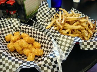 Admittedly the place was a little disorganized, but I guess that’s to be expected since it was a madhouse at the time. A kid showed up asking to take our order mere minutes after I had placed it at the counter. Pretty quickly we got our sides, nothing much to say other than the tots were cooked perfectly and the fries were better than most of the fresh-cut varieties I’ve had around here.