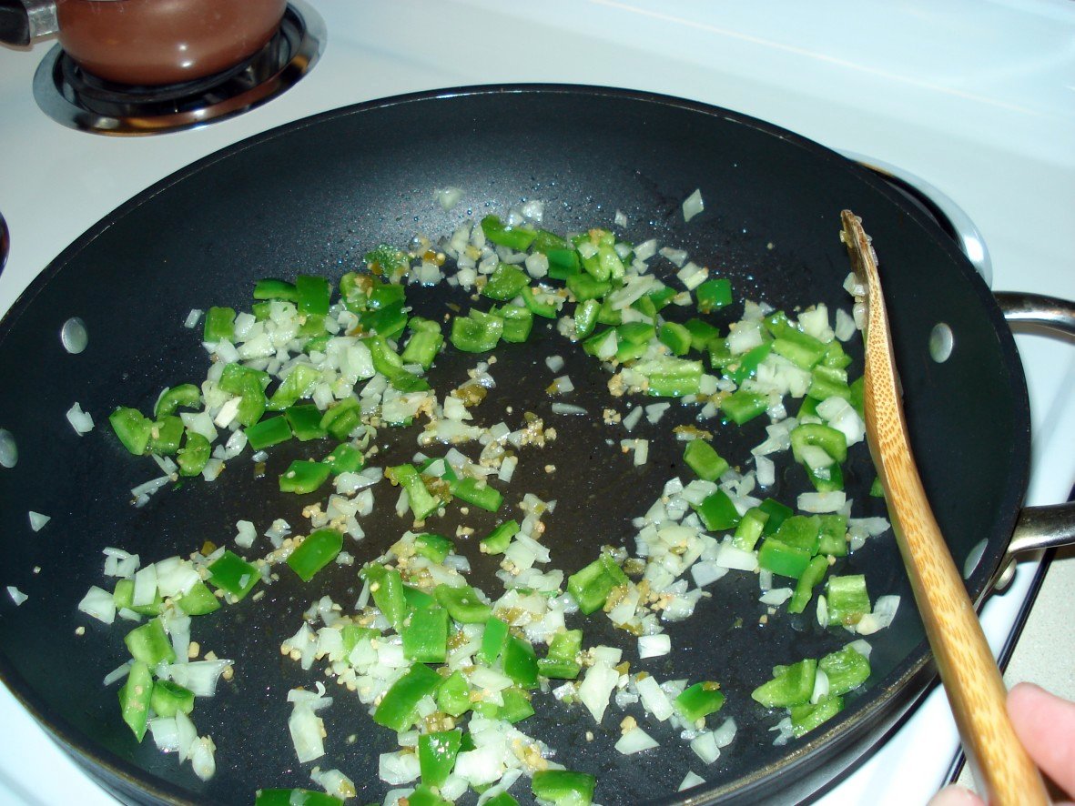 Step one is to open the beer, and drink it while doing the prep. For step two, heat the oil over medium heat in a large skillet. Once it’s up to temperature, add the onion, bell pepper, garlic and jalapenos, and cook for about two minutes while stirring occasionally.
