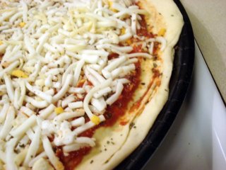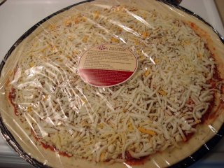 Based on the instructions stickered to the plastic wrap covering my pizza, I preheated the oven and the set the pizza on the middle rack. Checking it three minutes later, I noticed that the paper tray the pizza was resting on was smoking. After moving it up a rack, I waited another five minutes before checking again. At this point, the crust was getting pretty browned and the cheese was all melted, so after turning on the broiler for a few seconds to melt the cheese really well, dinner was ready.