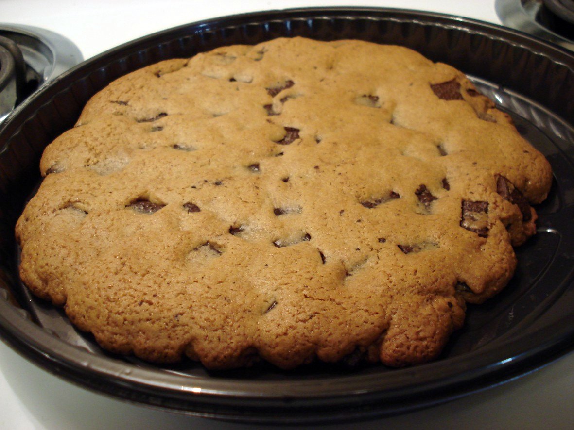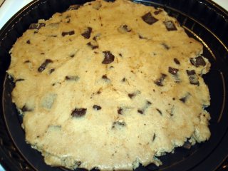 After eating two pieces of pizza and still not being able to decide how I really felt about it, I decided it was time to get the cookie in the oven. Even on the top rack and at a lower temperature than the pizza it was soon getting pretty brown around the edges, and I ended up taking it out before the center was cooked to my liking. Trying to find the right balance between letting it sit long enough to firm up a bit and not letting it get too cold (warm chocolate chip cookies are the best, right?), I ended up cutting it into sections that unfortunately fell apart when you tried to pick them up.