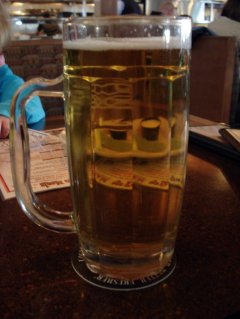 You would think this was simple enough, but I had no idea what I wanted other than the fact that it was a burger. Did I want to stick with something simple like the Bacon Cheddar since I’ve had so much trouble satisfying my craving for a good burger lately, or did I want to try something more ambitious like the Hillbilly with its blend of gorgonzola crumbles and blue cheese-infused mayo? The One Pounder appealed to me for a few moments due to its classic toppings and the fact a burger that big might be more difficult to overcook, which is a problem I’ve been running into fairly often lately. I also briefly flirted with the idea of trying their Black Angus Prime Beef cheeseburger with smoked cheddar. I kept bouncing back and forth between these options (getting momentarily distracted by the Moody Blue Penne pasta dish, of all things) before finally settling on a promotional burger shown on the front of the menu: the Bacon, Bacon, Bacon. I ordered my burger medium…not medium rare, not medium well, just medium…and hoped with everything I had that the kitchen would understand. Both of the grown-ups at the table being fans of the Ram’s Big Horn Blonde ale, we each ordered one; a regular for her and a large for me. The regular is a pint. I’m not exactly sure what unit of measurement the large is.