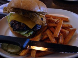 To be honest, I had ordered the Bacon, Bacon, Bacon almost against my own will, in a bizarre way. I was craving a basic cheeseburger, maybe a little bacon on top, but I simply couldn’t resist the call of a hamburger patty made with hickory smoked bacon, topped with chicken-fried bacon, garnished with lettuce, tomato and cheddar on a kaiser bun that has been smeared with chipotle-bacon mayo. Did I mention that you can add extra bacon for only ninety-nine cents more? I declined, as I did still want to taste a burger in all of this, but I needn’t have worried. The meat was a juicy and flavorful as it had looked, and the mayo was awesome, creating a constant but tolerable heat on the back of my tongue. The chicken-fried bacon was even better than I was expecting it to be. Even though the end result was a somewhat unusual burger, it satisfied my craving better than a lot of other burgers have lately. I was already speculating on which burger I’ll order the next time while I was only halfway through the one I was eating. Oh, lest I forget, I also opted to get sweet potato fries on the side for an extra forty-nine cents. I love sweet potato fries and try them pretty much every place I find them, and these are some of the better ones I’ve had. The other grown-up at our table, who had been talking all the way to the restaurant about how good their regular fries are, even remarked that perhaps she should have traded up as well.