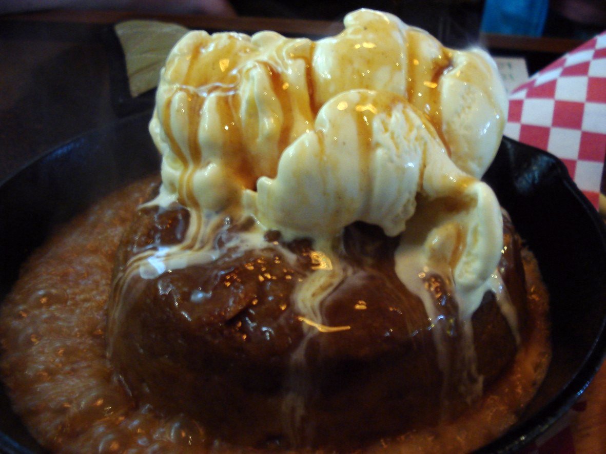 The Colossal Sizzling Bread Pudding certainly lived up to its name. The portion was huge, and served on a hot skillet with Dreyer’s vanilla ice cream melting on top of it. Asking for permission first, our waitress poured a generous measure of caramel all over the stuff which coasted the ice cream, dripped down the bread and formed an angrily bubbling pool on the surface of the skillet. I can think of no better way to describe the final product, a custardy, dense pastry-style affair with strong cinnamon, nutmeg and vanilla flavors, than to ask you to imagine French toast made with an entire loaf of unsliced bread which has been left soaking in the egg mixture overnight. It was almost overwhelming in density, richness and just plain strong flavors, but not quite. Even split between two people who enjoyed it, there was quite a bit left over.