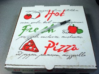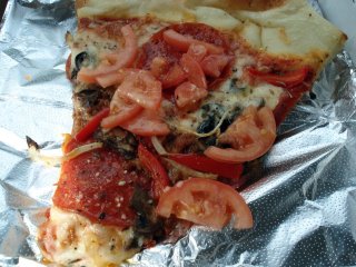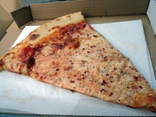 Even though it’s a stretch to get that far into Garden City and back on our lunch break, Sis and I decided that it was worth it. When we got there, the place was doing brisk (but not crazy) business. Sis ordered a slice of cheese pizza, while I decided I needed a slice of cheese and a slice of meat & veggie combo. After grabbing our free sodas, we gave the place a once-over. Some HDTVs are hung strategically, and most of them were broadcasting sporting events at the time. The whole place was impeccably clean, and is decoratted more like a NY-themed diner than an actual NY place, with identically-sized glossy pictures hung along one wall. The divider between the two halves of the dining room is actually a sihlouette of a cityscape, which I actually thought was pretty cute. Anyway, busy or not it doesn’t take long to heat a few pizza slices, so our order was up pretty quickly. Each of us were given a box that was large enough to hold a respectably-sized personal pizza, and off we went.
