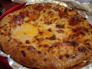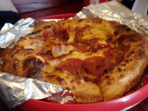 The children’s pizzas arrived first. Each was served on top of a piece of foil which covered an inverted frisbee. I have to admit that as a free toy with a kid’s meal goes, it’s pretty cool, but the pizza itself wasn’t as impressive. It frankly seemed overcooked to me, and neither of the kids put much of a dent in theirs. I tried a bite of the cheese one, which was okay but could have used more flavor. I didn’t much like the consistency of the cheese either, but it had cooled off quite a bit by the time I tried it so that could have been part of the reason.