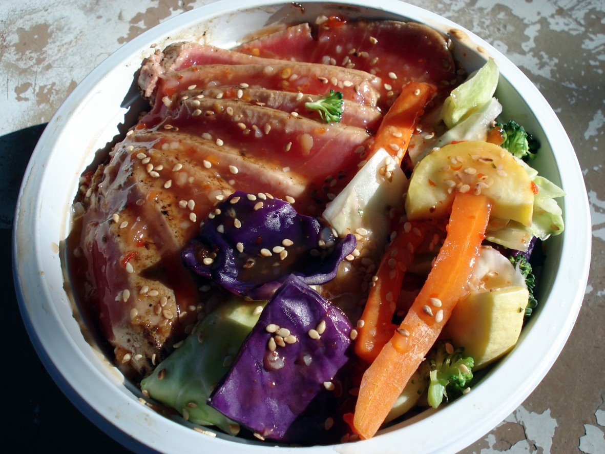 After securing half-priced Happy Meals for the kids, we went to pick up our grown-up version. My roommate is such a professional food sensualist that she has usually studied a menu and knows what she wants from a place long before she actually makes it there, and she wanted the aforementioned Zen Salad. Me, I figured I’d go with one of the standard bento bowls that make up the majority of their menu. Basically you get a pile of white rice (you can substitute brown rice, noodles or three times the normal amount of veggies), steamed vegetables, and the protein and sauce of your choice. On the protein side, we have chicken, beef, salmon, tofu and ahi tuna, or you can just get a completely vegetarian bowl. There are six sauces to choose from, ranging from a light and mild teriyaki to a spicy chili-garlic sauce that they recommend as an accent but also say is very good on its own. I went with the ahi tuna (it’s very difficult for me to pass up sushi-grade tuna) and the Zen sauce, their medium-hot sweet chili sauce. While I was waiting, I noticed the cooler to the right of the counter, and more specifically I noticed the sushi in it. Now it isn’t much different than what you’d get at one of the better grocery stores, but the inari (sushi rice in a fried soybean curd pouch) was looking good, so I tacked on a package of inari and various California roll-style sushi to my order. When everything was bagged and ready to go, I grabbed a selection of plastic flatware, napkins, and those horrible disposable chopsticks that come in one piece which never breaks apart correctly, and we all headed down the street to the park to eat (this was a bad idea in retrospect since though it was sunny and warm enough, it was also VERY windy, and during the course of the meal several things just flew away).