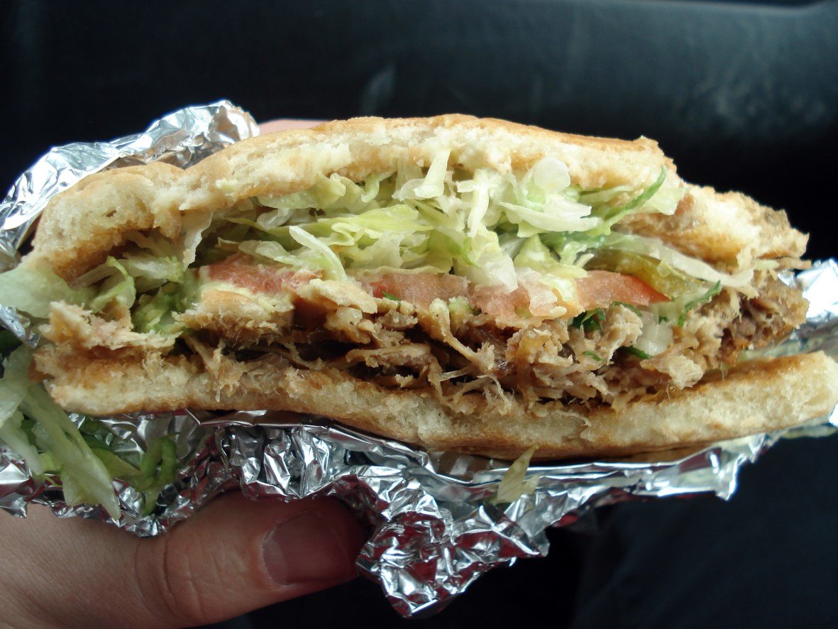 …and no, it’s not the addition of cheese. It’s to replace that breaded beef with the delicious fried pork known as carnitas. There’s something about the juicy, lightly crispy, perfectly seasoned bits of pork that puts the whole thing over the edge. The good people at Tacos Aguililla really make this sandwich right, and it’s hard to imagine the ingredients being in any better proportion. You can taste EVERYTHING, and nothing overwhelms anything else. The lettuce and tomato help to lighten up and balance out what could otherwise be a rather dense and possibly too strongly-flavored sandwich. The creaminess of the avocado and the mayo control the heat and tanginess of the jalapeno. Probably most importantly, the veggies and the bread keep the the pork and the inside of the roll from making the whole thing too oily. I’m not exactly sure what the pork is fried in, but I’m relatively certain butter is used to crisp up the roll since it’s the only way I know of to do it that perfectly.