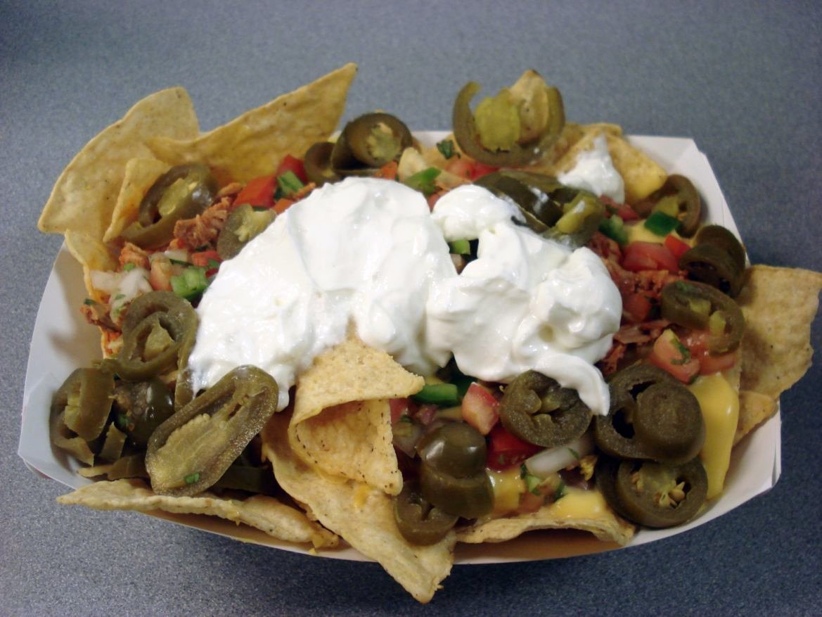 Me, I’m a creature of habit. I decided long ago that my two favorite taco truck items are the tacos (duh) and the tortas. My first time at a new truck I pretty much exclusively order an asada taco and a carnitas torta, the former because the quality and handling of the steak is a good indicator of the truck as a whole, and the latter because…well, because I’m a pork freak. It’s a cash setup here, but you can’t argue with the prices: it was a buck for the taco and five for the torta. For another four dollars, I also added on an order of chicken nachos for my sister who was suffering from a really bad cold at the time.