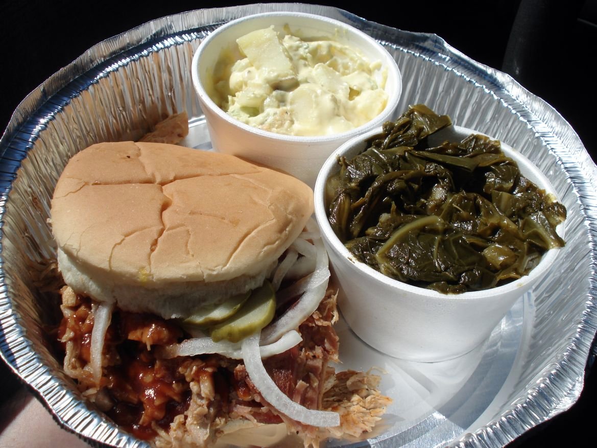 | Pulled Pork Sandwich with collard greens and potato salad |