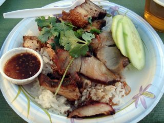 | Khao Moo Daeng and Moo Krob combo plate from Nor-mai |