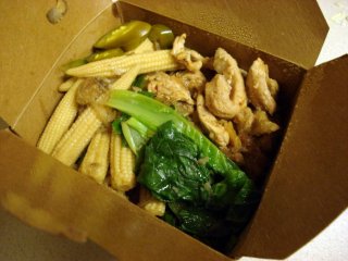 First I picked up some Japchae from Korean Kitchen: a stir fry of rice noodles, marinated beef, soy sauce, garlic, sugar, sesame oil, onions, scallions, green and red peppers, carrots, spinach, and both white and shitaki mushrooms.  I loved this dish, especially the tender bits of exquisitely-flavored beef and the red peppers.  This was probably the best thing I’ve ever had from them, surpassing even the amazing seafood pancakes I had at the first BUM event I attended.  Unfortunately, I was given to understand that this might have been their last appearance at the BUM.  Here’s hoping that some mind-changing will take place, or that someone else will step in to take up the torch.