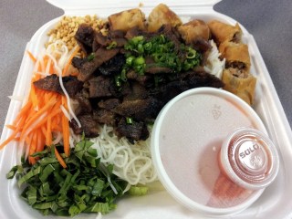My favorite Vietnamese dish (so far) is bun cha gio thit nuong, a decidedly non-soupy mix of rice noodles, grilled pork, sliced egg rolls, and various garnishes and condiments, and since it’s my personal yardstick dish it’s pretty much always the first thing I order when trying a new place. Several months ago, I stopped by Pho Bac for a to-go order. Some remodelling had taken place since my last visit back when it was Chau’s, but the furniture and checkered flooring remained.