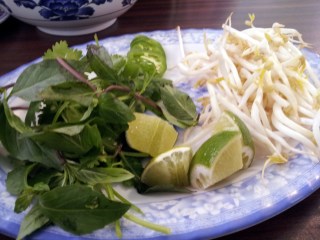 | Standard pho garnishes, including sprouts, Thai basil, lime and jalapeno. |