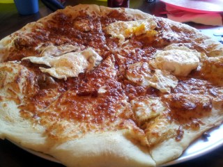 Finally the pizza came, and I immediately saw the trouble in paradise. Our eyes scoured the pie and then sized up our fellow diners. There were simply not enough eggs to go around.