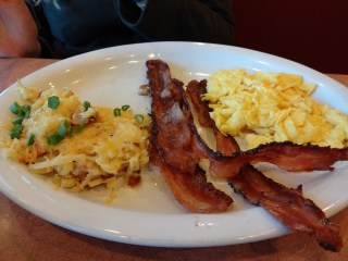 So, of course it wasn’t long before we returned, this time taking the roommate’s kids. The five year-old has pretty wide-ranging tastes, but the tween may be the pickiest eater I’ve ever come across. Both of them were very happy at Joe Momma’s. In between bites, the little one said “It’s good here.” On this visit, both of the grown-ups ordered The Classic: choice of bacon or sausage (link or patty), two eggs, choice of house potatoes or hash browns, and bread selection (toast, biscuit, French toast or pancake). What I really wanted was the Steelhead Scramble, but it’s probably not the best choice early in the morning when you’re with three people who don’t care much for fish.