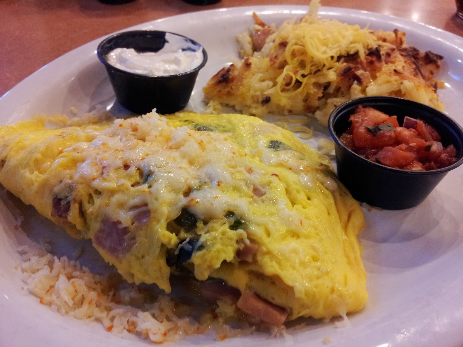 The Green Eggs and Ham Omelette may not be appropriately named (since neither the eggs nor ham are green), but it is pretty wonderful regardless. It’s a three egg affair containing baked ham, Muenster cheese (criminally underused as a breakfast ingredient), and fire-roasted green chilies, with sour cream and salsa on the side. In addition to this monster, I paid a slight upcharge to replace the normal potato options with their not-on-the-menu-but-seemingly-always-available hash brown casserole. For my bread side, I opted for the French toast. You read all that correctly, and trust me when I say you won’t need another meal for a while if you order this one.