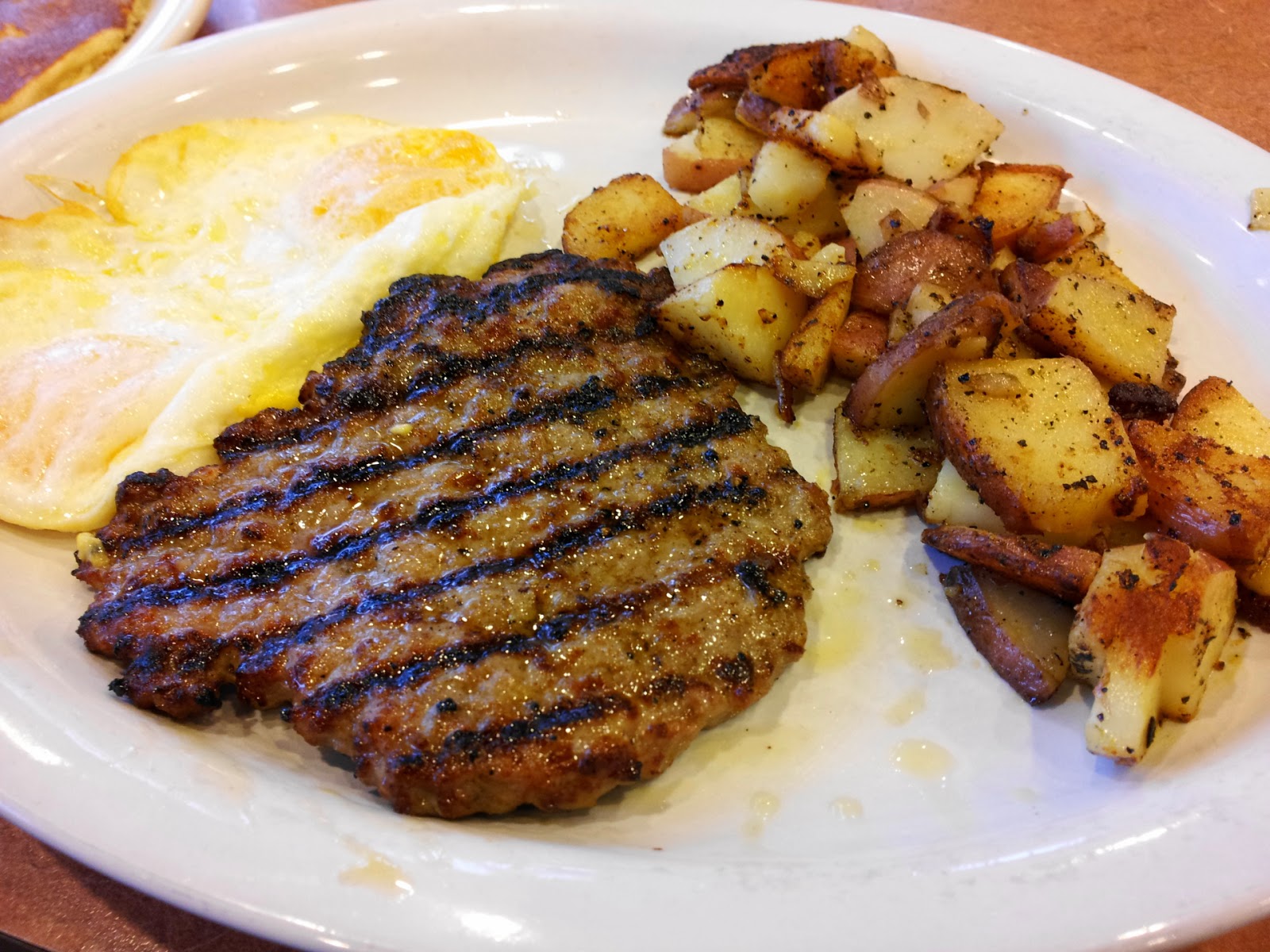 | The Classic with over-medium eggs, house potatoes and sausage patty |