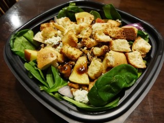We were both very fond of the salad which, in addition to the namesake spinach and fresh fruit (apples), came with pecans, croutons, bleu cheese, bacon crumbles and a lightly-applied balsamic fig dressing. This is definitely one of the best salads I’ve ever had from a fast food/fast casual place, and it raised our expectations for the rest of the meal.