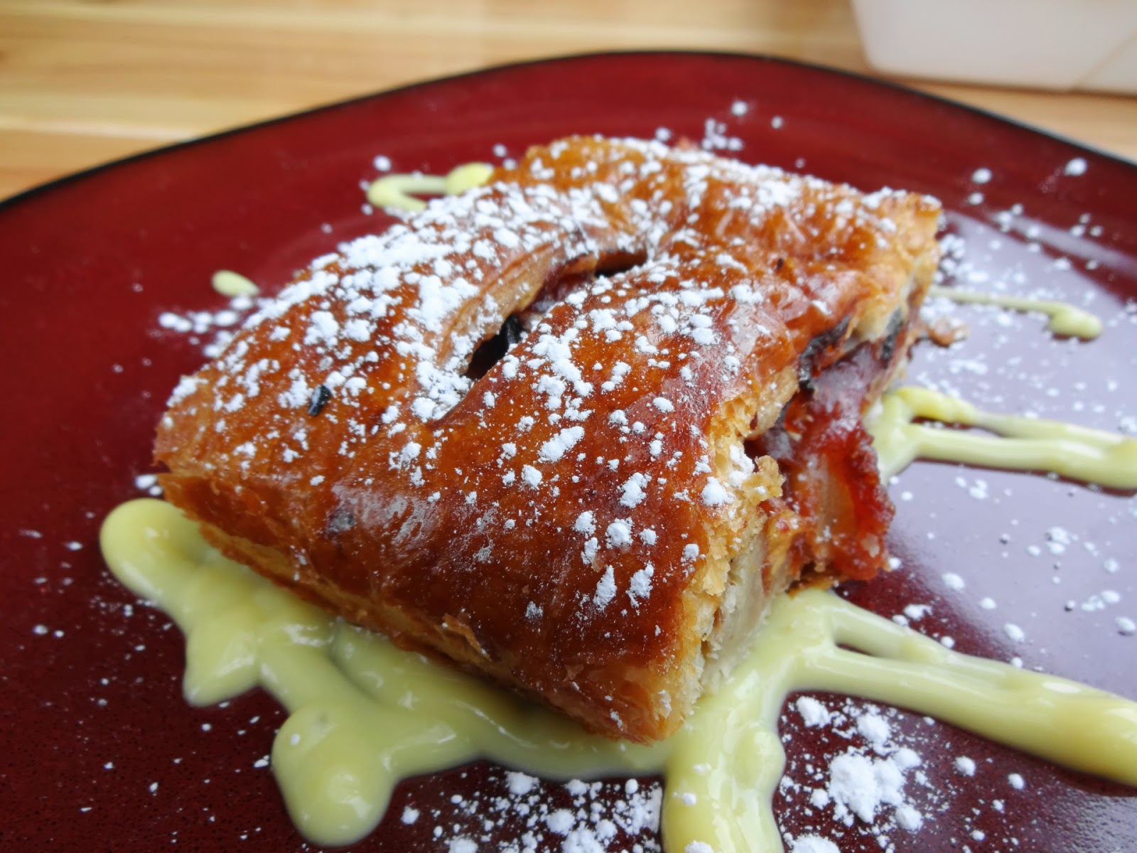I’m a little picky when it comes to restaurant coffee since I take mine black, and I was very happy with what I was served here. The strudel itself was nicely browned, the outer layers so light and crispy that putting a fork to them made a sound like walking in Autumn leaves. The apples were sliced thin enough that there was no danger of them being undercooked, and the whole was garnished with a custardy vanilla sauce and powdered sugar. We tore through dessert in fairly short order, finishing just as it began to rain again.