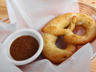 Instead, we were brought our respective no-octane beverages and a fresh pretzel to share, and we both fell in love with the coarse sweet mustard that accompanied it. My soft drink reminded me of a non-alcoholic hard cider, if that makes sense. I wouldn’t ever have a glass of apple juice with a meal as it tends to be a little overwhelmingly sweet, but the sparkling water tamed it to a pleasant and manageable level. As we tore and dipped, one of the restaurant workers stepped out on the patio and had a long phone conversation in German, adding to the atmosphere and prompting my roommate to complain that she wants to visit Europe again.