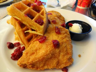Well, quite a bit actually. The chicken itself now has a sweetness to it from the maple rather than the savory counterbalancing flavor that it used to, and there’s not a lot of crunch involved, maple or otherwise. The pieces are a little smaller (I can’t help thinking that the new presentation method conveniently hides that fact), and it turns out that a stacked waffle steams itself into a state of soggy limpness if left on the counter for a minute or two while waiting for the waitress to serve it. And craisins? What the hell is with the craisins? The waitress returned to refill our drinks just as I was brushing them off my food, prompting her to ask if I didn’t like them. When I pointed out that the menu made no mention of them, she said it the latest presentation tweak, the previous one being a sprig of rosemary driven through the waffle segments to keep them vertical (also not mentioned on the menu). Once I’d ditched the fruit, I unstacked the waffle to keep it from deteriorating any further and arranged everything so that it looked more so like what I remembered from my previous visit. Next I reached for the syrup, only to find that it was room temperature. I had brought both of the roommate’s kids this time, and both had ordered the waffle from the kid’s menu. Because theirs weren’t stacked, they had retained that nice, crispy outside. I envied that they had at least that as I worked through my limp waffle, sweet chicken and cold syrup, most of my enthusiasm gone now.