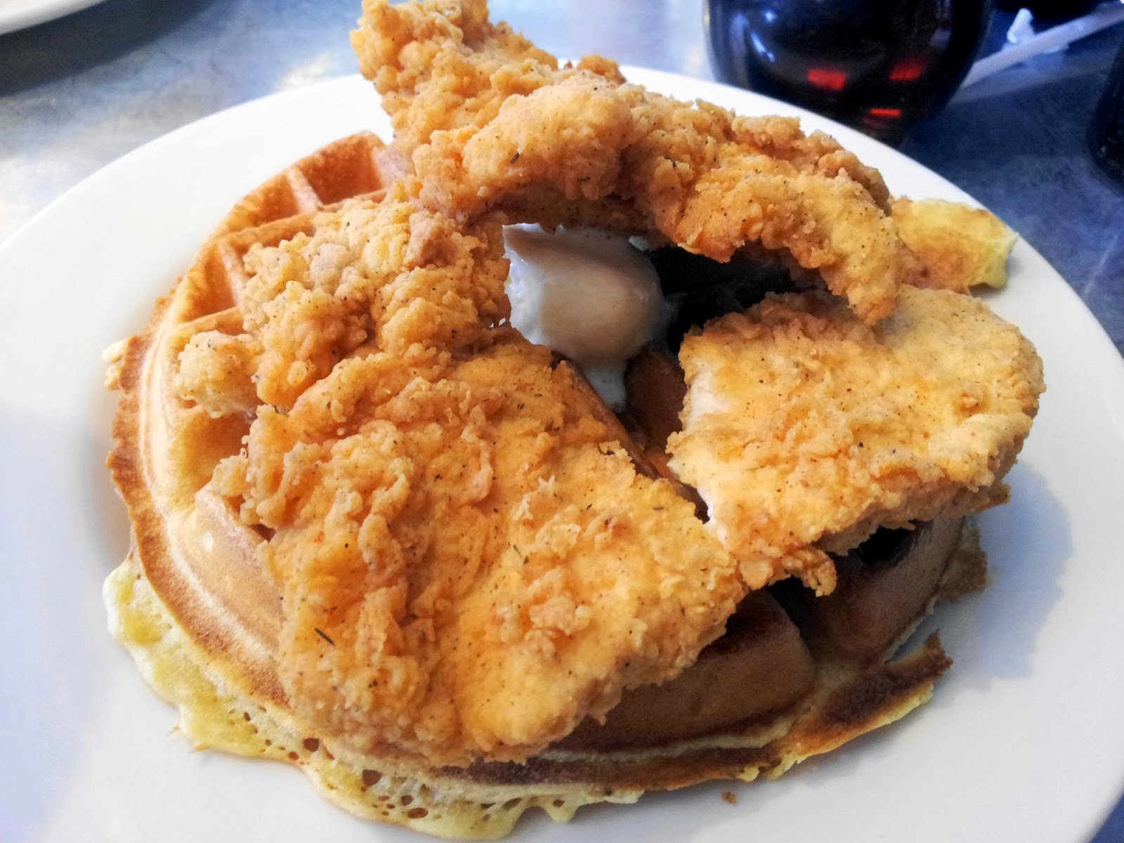 This was the best I’ve ever had this dish. With most of the other places in town using wings (which I’ve always thought of as a lot of work with not much reward), infused syrups, flavored butters or specialty waffles, it was nice to just have a good Belgian waffle with two pieces of nicely crispy chicken so big that they hung over the sides a bit. You had to be careful with the syrup, which was warmed so much that it was positively thin and came flooding out of the dispenser. This molten sugar reduced the waffle to mush wherever it landed, but drizzled over the chicken it allowed the waffle to keep its integrity, while the lack of bones allowed one to devour the whole with impunity. As for the flavors: completely classic. Belgian waffle, whipped butter, maple syrup and of course the savory fried chicken seasonings.