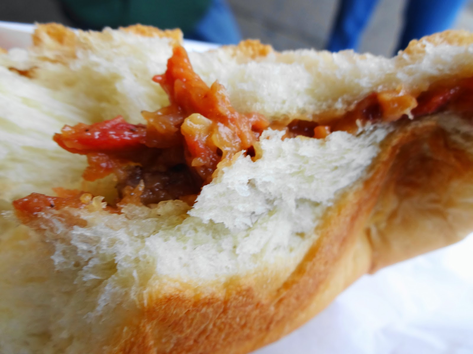 So, Biscuit Bitch. You could say the name is immature. Gimmicky. An attempt to draw the attention of tourists. Maybe all of these things. But the important thing is that the food is damn good. The fact that they had a substantial line of people waiting for a turn to order at a time when a lot of the other eateries we passed had nothing but bored workers gazing out their windows speaks to that. The place is a hip little hole in the wall with a mock-Southern vibe, which makes sense given the menu and location. And of course, most of the menu items have fun, vulgar little names. This made ordering slightly difficult for me. Should I choose the item with the funniest name, or just the one that sounded like the best dish? Most of the truly outrageous names were saved for the biggest plates, and I wasn’t all that hungry anymore after the pork bun, piroshky and cheese samples. In the end I went with the straightforward, egg and cheese Bitchwich breakfast sandwich. Yes, it’s another vegetarian item. Put your head down and take deep breaths until the shock passes. If we had been there during lunch hours and I’d had a bit more of an appetite, I would have chosen the sandwich dubbed You Lucky Bitch (sort of their take on a Cuban sandwich), but it will have to wait for another time.