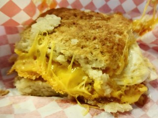 And that is in spite of Little Sister’s order, the Canadian Bitch. Same great biscuits, fine, and bacon is of course a generally welcome addition to any breakfast item. So, it has to be the maple peanut butter that put the rest of us off. Seriously, the rest of us didn’t even like the smell, a fact that was confirmed when Little Sister whipped out the half she didn’t finish later on as we were driving toward home. Still, it made an impression on her, and she has mentioned craving it since then.