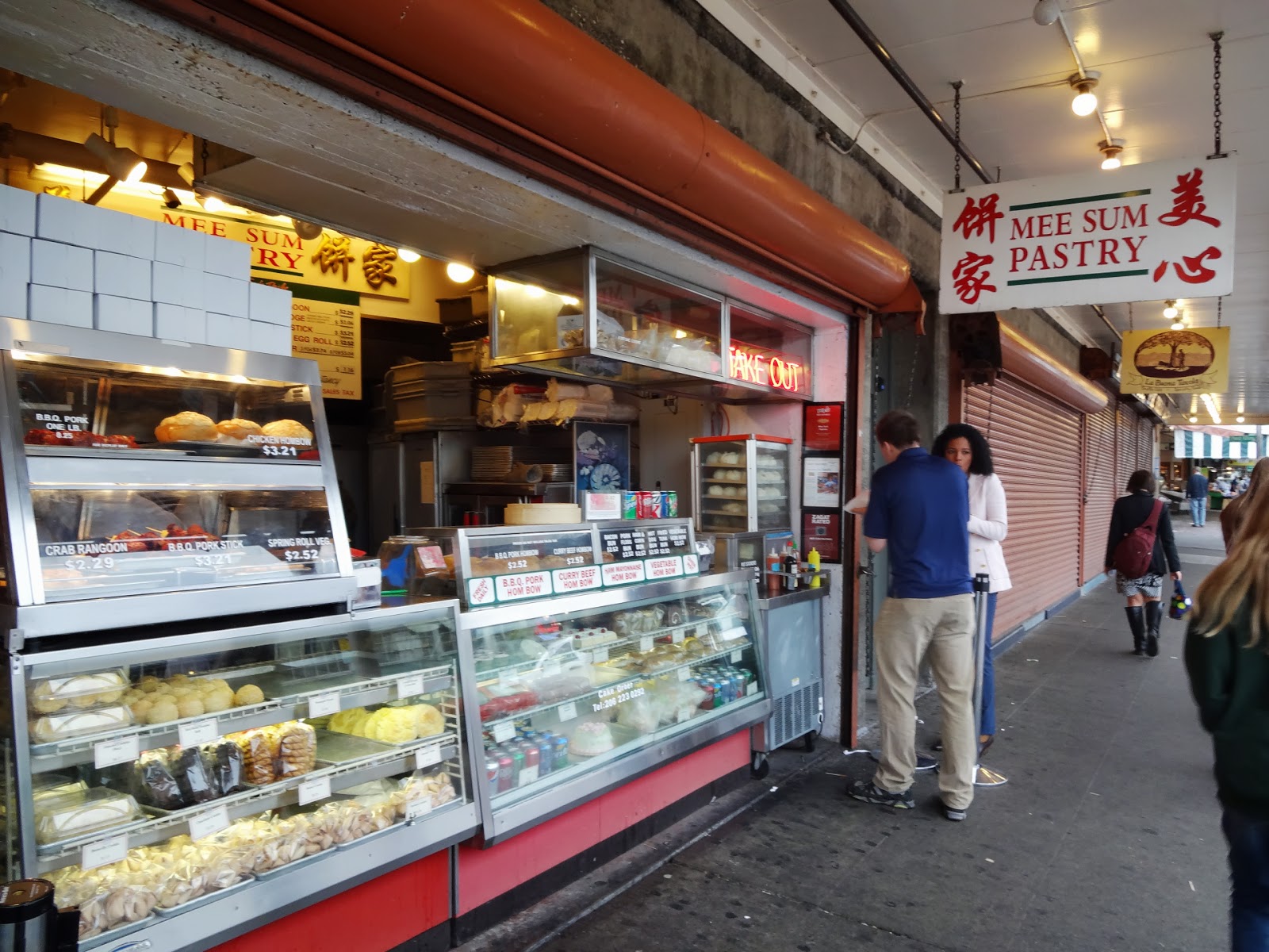 I couldn’t believe that I was going to have gone to Seattle for three days…well two, really…and not have any seafood, but that’s how it was shaping up. There didn’t seem to be much point in getting any unless it was fresh, and the chilly gray morning didn’t inspire a fresh fish craving. Then again, I still hadn’t had any coffee, either. For my first bite of the day, I chose the Mee Sum Pastry counter across the street.