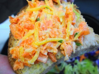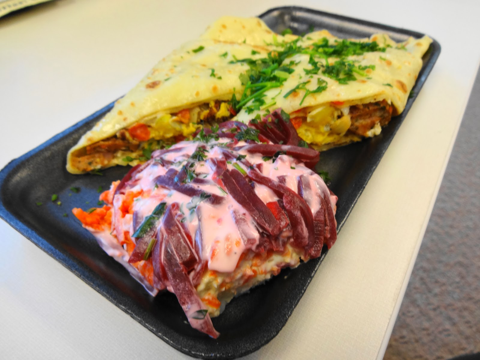 The first thing I tried from Royal was their breakfast Sausage Crepe: egg, red bell pepper, onions, and gluten free chicken sausage, all wrapped up in a crepe like a breakfast burrito. I could care less about whether the sausage is gluten free, but it’s freaking tasty. That intriguing-looking pile of deliciousness in the foreground is a layered salad of beets in some kind of creamy sauce, carrots, eggs and shredded potatoes. My experiences with beets have been largely negative, so I was pleasantly surprised to find that these had none of that “earthy” (read: like eating dirt) flavor that I’ve encountered before.