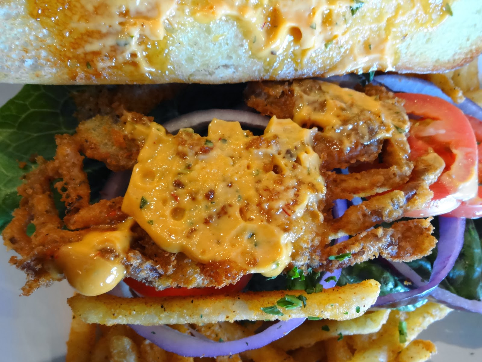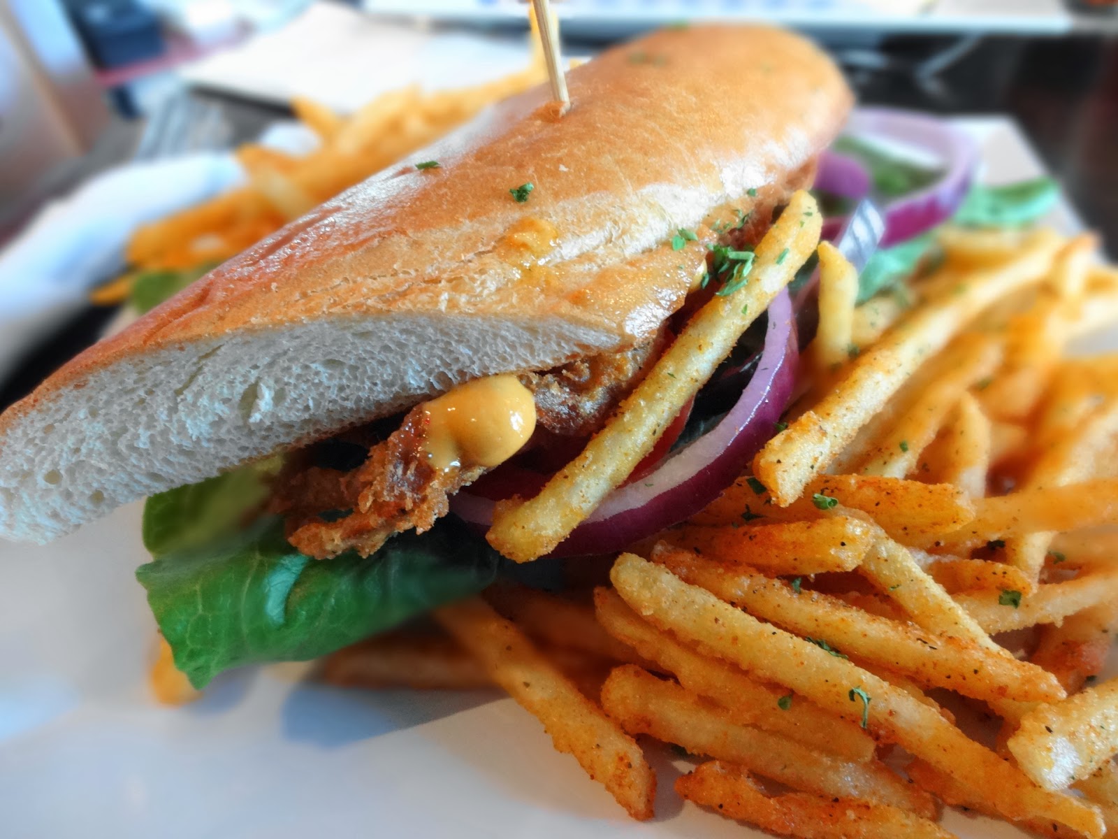 My entree was a little less thrilling. If you Google “Po’ Boy”, you get back a lot of pictures of sandwiches, mostly seafood varieties, stuffed to overflowing. The things originated from Louisiana, for cryin’ out loud. They don’t half-ass their edibles there. Here we have a decent baguette with red onion, tomato, lettuce, and chipotle aioli. I don’t know what makes it “select”, since those are pretty much the standard po’ boy toppings. Maybe it’s the chipotle? Regular mayo is typical. Maybe it’s the protein? There doesn’t seem to be a lot of it, does there? Let’s take a look inside…
