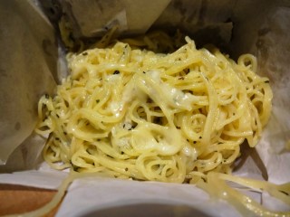 Au-Oue – I know, a pasta side dish at a joint with this many pasta options…trust me, this is different. The capellini is as light as air, comparatively speaking, sauteed with garlic, parsley and asiago. Very, very nice.