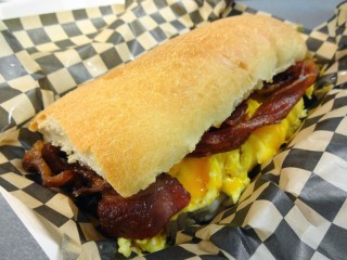 For a long time, we’ve been told that breakfast is the most important meal of the day. Have breakfast at Saladman though, and it might be the ONLY meal of the day. A co-worker and I decided to order that bad boy you see above one morning, and because we both have a fondness for bacon and evil sandwiches, we went all out with it. You see, the Egg Sandwich (scrambled egg, cheese, potatoes and meat of choice) comes in three sizes: 4″ with two eggs, 6″ with three eggs, and 8″ with four eggs. We kind of dared each other to get the biggest size. The bread was decent enough, the eggs scrambled perfectly and neither too runny or too dry, the potatoes neither too crisp or too limp, and the cheese both generous and perfectly melted. The bacon wasn’t quite as crisp as I would like…wait, let me clarify that. Two of the strips of bacon weren’t quite as crisp as I would like. The other four were just fine.