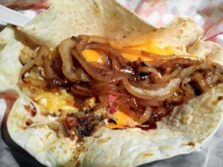 I knew what was going into this thing from my previous conversations with David. It has a long history, but if you’re interested you should just ask David yourself, he tells it better. In its current incarnation, it includes roasted hand-shredded chicken, shredded potatoes, shredded peppered bacon, a pile of cheddar jack cheese, and a little steam action to melt and incorporate everything. The resulting hot mess is dumped onto the aforementioned grilled tortilla, to which a generous amount of ranch dressing and sweet chipotle barbecue sauce has been applied. Watching this thing being assembled was interesting. There didn’t seem to be any rhyme, reason or measuring system involved. Still, it smelled damn good, and when he offered to add some grilled onions into the mix I accepted with nary a second’s hesitation, even though grilled onions ALWAYS give me heartburn. The whole thing was put together in less than three minutes, and now that the streets and sidewalks were starting to fill up I decided to go and eat in my car since I’d paid five bucks for the parking space (freaking special event parking). To be fair, I probably wasn’t in the best state of mind for trying something new. I’d pulled something in my neck while moving furniture earlier in the day and the pain was spreading upward and turning into an annoying headache. I also wasn’t really that hungry despite not having really eaten all day. Though the item is called a “wrap”, David had left the tortilla open, so I took the best picture I could using my car’s dome light and tucked in.